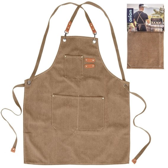 Fartuch kuchenny wiązany o wymiarach 68 x 74 cm. Fartuch wykonany jest z poliestru 65% i bawełny 35% w kolorze brązowym. Sznurki do wiązania wykonane są bawełny, lnu a także ekoskóry. Można go łatwo dopasować do każdej sylwetki, dzięki sznurkom umożliwiającym odpowiednią regulację. Fartuch można prać w pralce w temperaturze do 30°C.
