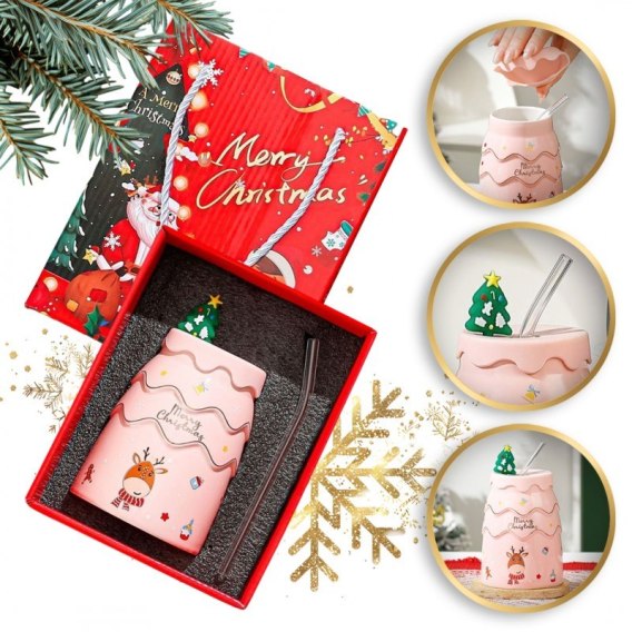 KUBEK ŚWIĄTECZNY - zestaw z silikonową pokrywką i rurką 400ml, różowy KB06R