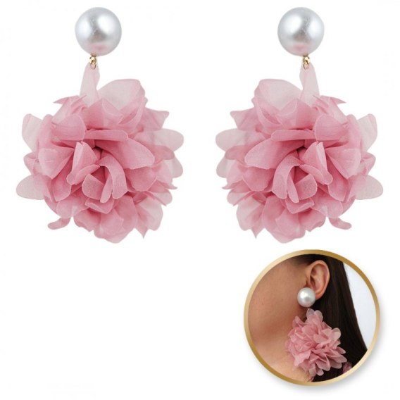 Kolczyki wiszące, efektowne tiulowe kwiat z perła, sztyft krem K1710