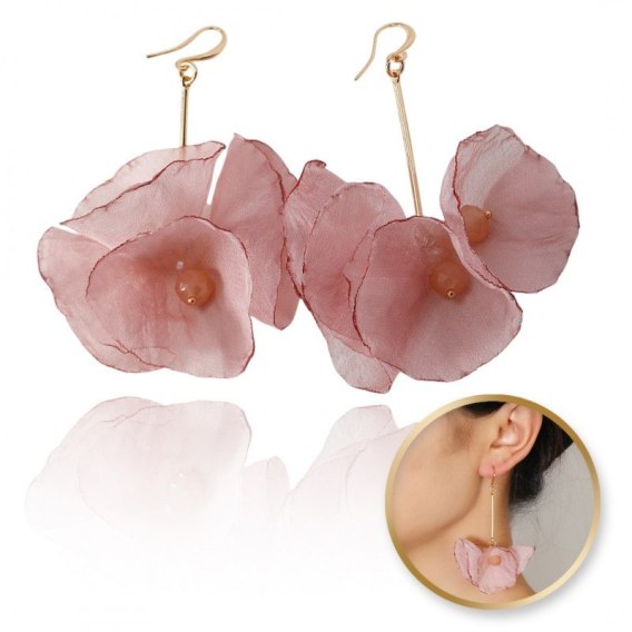 Kolczyki wiszące, efektowne tiulowe z koralikami pudrowy róż K1702