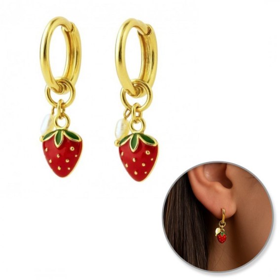 Kolczyki ze stali szlachetnej platerowane 14k złotem, TRUSKAWKI wiszące czerwone KST3406