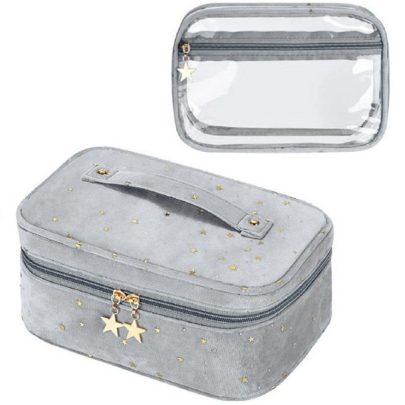 2 Piękne, damskie rozkładane kosmetyczki, dostępne w kolorze szarym Kosmetyczka kuferek wykonana  jest z miękkiego, welurowego materiału. Bardzo praktyczna i uniwersalna.