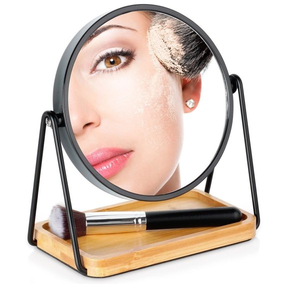 Dwustronne lusterko na stojaku. Lusterko możemy postawić na blacie lub stole, dzięki czemu będziemy mogli wygodnie wykonywać przy nim makijaż lub proste zabiegi kosmetyczne. Jest świetnym pomysłem na prezent dla każdej kobiety. Modny design sprawi, że idealnie pasuje do każdego wnętrza.