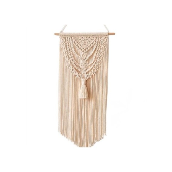 Piękna makrama w klimacie boho pasująca do wielu wnętrz Ozdoba możliwa również do zastosowania do sesji fotograficznych czy jako dekoracja przy wielu tematycznych uroczystościach Makrama wyplatana z bawełnianego sznurka plecionego o grubości 5 mm. Wymiary: