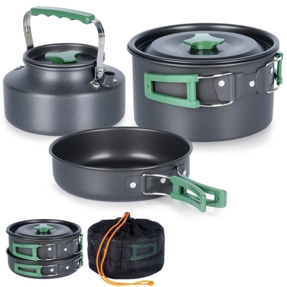 <li><strong>KOMPLETNY ZESTAW</strong> - Zestaw naczyń kempingowych w skład którego wchodzą: garnek, patelnia oraz czajnik do gotowania wody. Garnek posiada średnicę 17,5 cm, wysokość 9,5 cm i pojemność 1,65 l. Patelnia ma średnicę 18 cm, wysokość 4,5 cm i pojemność 750 ml, dodatkowo czajniczek do gotowania wody o wymiarach 15 x 8,5 cm i pojemności 900 ml. W zestawie dwie pokrywki: jedna pasująca do garnka lub patelni oraz mniejsza przeznaczona do czajniczka.</li>
