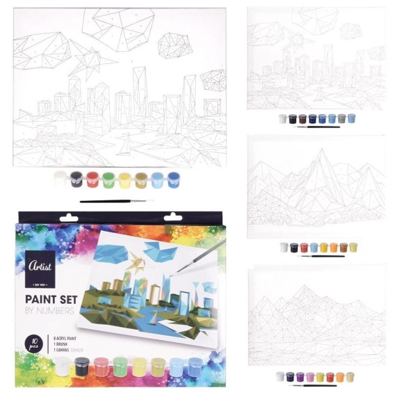 Zestaw do malowania po numerach. W zestawie: 1x płótno z obrazkiem o wymiarach 30 x 40 cm umieszczone na ramie, 1x pędzelek, 8xfarby akrylowe. Zestaw jest świetnym rozpoczęciem przygody z malarstwem zarówno dzieci jak i dorosłych. Dzięki liczbom umieszczonym na obrazie możemy stworzyć piękny i malowniczy obraz. Malowanie jest wyjątkową formą spędzania wolnego czasu, pozwala nam się skupić oraz zrelaksować. Podczas malowania rozwijamy również zdolności manualne. Farby akrylowe nie są toksyczne, dzięki czemu mogą być używane przez dzieci oraz kobiety w ciąży. Kolory są żywe i idealnie kryjące. W ofercie są dostępne łącznie 3 wzory, produkt wysyłamy losowo i nie ma możliwości wyboru konkretnego wzoru. Oryginalny produkt holenderskiej marki Artist. Wyprodukowano zgodnie z europejskimi standardami.