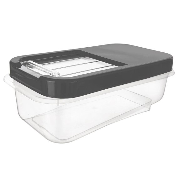<li><strong>ZAMYKANY</strong> - Wyposażony w pokrywkę z przesuwanym zamknięciem oraz pochylone dno, co zapewnia szybki i łatwy dostęp do przechowywanych produktów. Dzięki temu nie trzeba otwierać całego opakowania, aby wyjąć potrzebną ilość produktu. Pokrywa ochroni przechowywaną żywność lub przedmioty przed wilgocią i innymi czynnikami zewnętrznymi.</li>