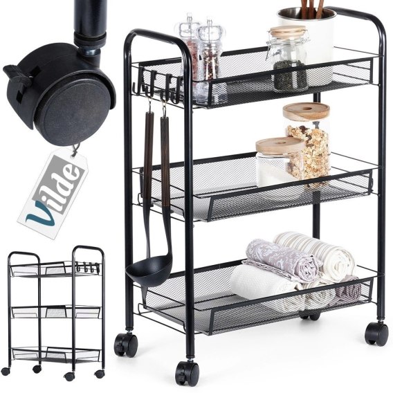 ⭐ Pojemny, z trzema koszykami i haczykami - Wózek posiada trzy koszyki do przechowywania. Zajmuje niewielką powierzchnię, a jednocześnie jest bardzo pojemny. Dodatkowo posiada cztery haczyki na których możemy zawiesić np. przybory kuchenne, ręczniczki lub ścierki.