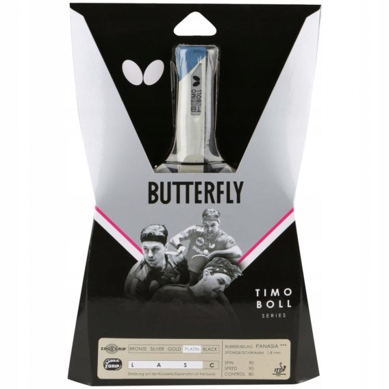 Rakietka do tenisa stołowego Butterfly TIMO BOLL PLATIN umożliwia wszechstronną grę z użyciem top spinów, bloków i kontrataków. Guma Panasia z gąbką 1,8 mm oraz technologie Parabolic Grip i Ergo Grip umożliwiają zarówno grę ofensywną, jak i defensywną.