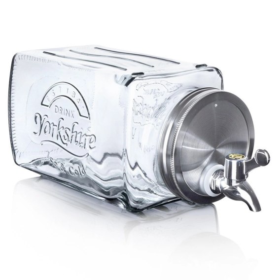 Szklany dystrybutor z kranikiem idealny do serwowania wody, lemoniady, soku, herbaty mrożonej, wody smakowej, ale również ponczu. Dostosowany do przechowywania w lodówce. Dzięki kranikowi w łatwy sposób zaserwujemy ulubione napoje w sposób efektowny. Słój wykorzystamy zarówno w ogrodzie, jak i podczas spotkań rodzinnych. Dzięki zamykanej pokrywie żadne owady nie dostaną się do naszego napoju.