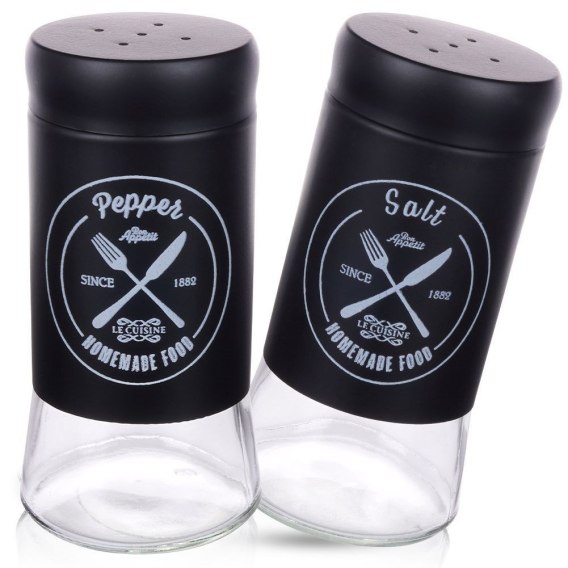 Zestaw dwóch pojemników solniczki i pieprzniczki o wymiarach 11 x 5,5 cm. Wykonane ze szkła oraz czarnego metalu, posiadają efektowne zdobienie. Idealna do użytku codziennego, ale również przydatna w lokalach gastronomicznych. Pięknie prezentują się na stole. Wyprodukowano zgodnie z europejskimi standardami.