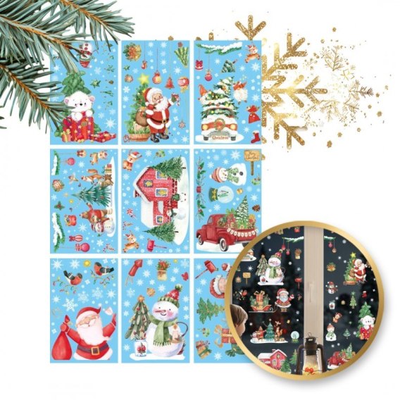 Świąteczne naklejki kolorowe na okno 9 Arkuszy 20 x 30cm NKD12