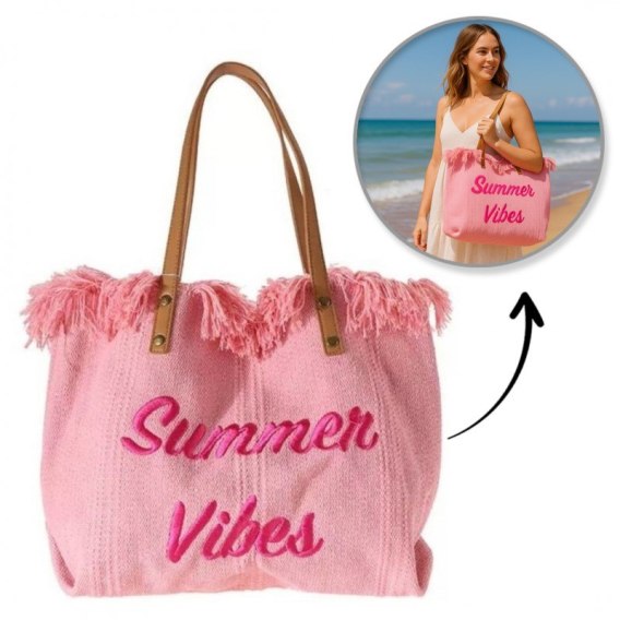 TORBA PLAŻOWA , na zakupy duża i pojemna z frędzlami BOHO, róż TP11R