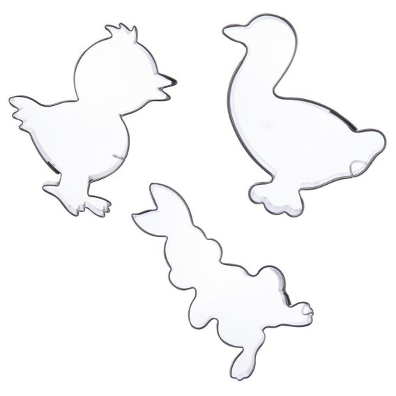 Zestaw trzech wykrawaczy cukierniczych w różnych wielkanocnych kształtach. Wykonane z wysokiej jakości stali nierdzewnej. Dzięki nim przygotujemy ciastka, pierniki oraz ozdoby z masy cukrowej na torty, ciasta i desery. Kształt zajączka, kurczaczka oraz gęsi świetnie sprawdzi się w okresie wielkanocnym, ale również poza nim. Foremka jest niezwykle łatwa w obsłudze, w łatwy i precyzyjny sposób wykroimy ciasteczka. Przygotowywanie ciasteczek to świetny sposób na spędzenie czasu z dziećmi w kuchni.Oryginalny produkt czeskiej firmy Orion. Wyprodukowano zgodnie z europejskimi standardami.
