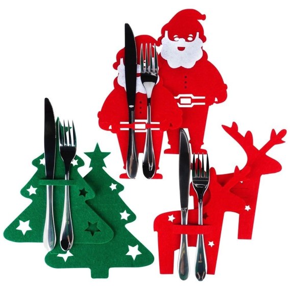 Komplet sześciu etui na sztućce w świątecznym kształcie. W zestawie: 2x etui w kształcie Mikołaja (22 x 13 cm), 2x etui w kształcie choinki (21 x 16,5 cm), 2x etui w kształcie renifera (17,5 x 14 cm). Niezwykle elegancki dodatek do nakrycia stołu. Nadadzą niepowtarzalnego, świątecznego klimatu. Idealny pomysł na świąteczny upominek.